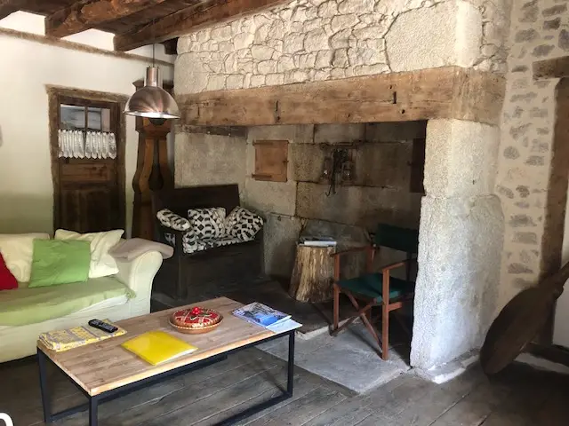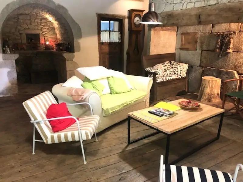 La pièce à vivre du gîte a conservé son vieux plancher en chêne, le plafond aux poutres apparentes et de nouveaux crépis à la chaux.