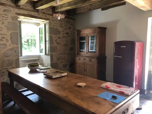 La cuisine au style campagnard dispose d'une table de ferme de 3 mètres de long.
